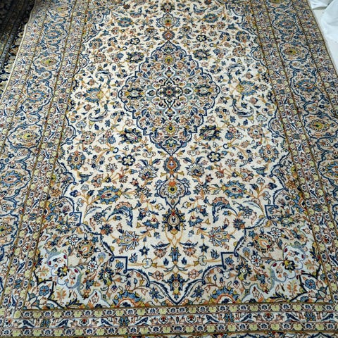 En äkta handknuten persisk matta kashan I hög kvalitet ullmaterial mycke fint skick mattan kommer från djur och rökfri hemma miljö storlek 395×300cm pris 7900kr leverans kan ordnas inom Stockholm och Uppsala.