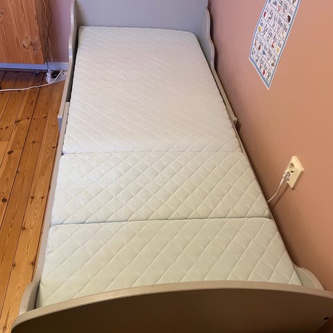 Utdragbar barnsäng eller växa-säng. 80*200 cm. En äldre variant av Ikea-säng som nu har säkert 30 år på nacken. Den har använts av minst fyra barn nu! Gediget trä. Jag tog över den från en vän för 14 år sen och målade om den med grå milk paint, så sängen är unik och har en touch av shabby chic. Jag satte sonens namn på sänggaveln och sen nästa sons när han tog över sängen. Så det är med stort vemod att sängen ska gå vidare, men även minstingen vill numera ha en "vuxen-säng". Vi spenderade kvällen med att ta bort klistermärken de satt på genom åren. De lossnade fint. Det är allmänt små märken här och där som bara gör sängen än mer charmig, den är även målad så att den ska se naturligt sliten ut. Sängen är utdragbar och kan anpassas i längd efter barnets behov. Ram i trä med ribbotten i gedigna träribbor. Madrassen ingår, den är bara några år gammal och sällan använd (då minstingen knappt sovit i egen säng). Madrassen har jag delat så det nu är två förlängnings-delar man kan lägga till allteftersom man drar ut sängen. Nu är sängen nedmonterad, så går enkelt att hämta. Finns i Näsby park, Täby.