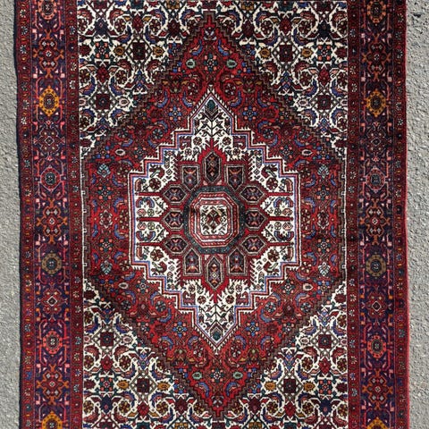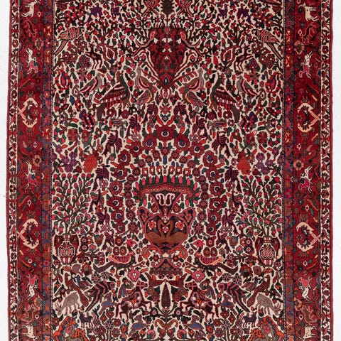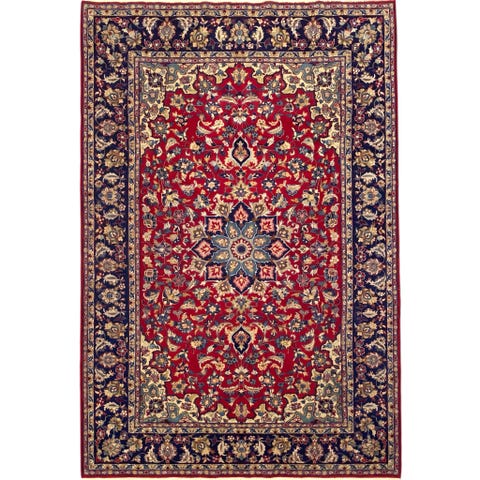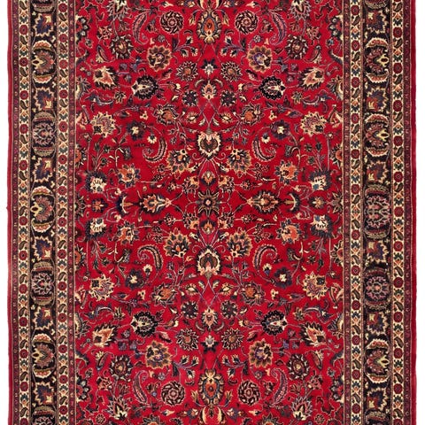 Den djupa röda bottenfärgen samspelar harmoniskt med mörkblå och krämfärgade nyanser i ett rikt, symmetriskt blommönster – ett tydligt kännetecken för finare Mashad-mattor. Den täta knytningen och den välbalanserade färgpaletten ger ett exklusivt och tidlöst uttryck som lyfter både moderna och klassiska interiörer.