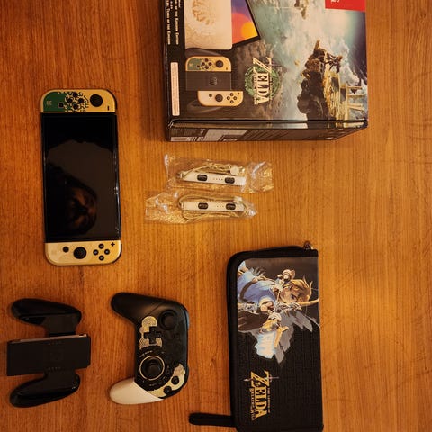 Säljer en Nintendo Switch OLED-modell. Konsolen kommer med en dockningsstation, en Joy-Con-hållare, en strömadapter och en bärväska med Zelda-tema. Ett SanDisk 128 GB microSD-kort för Nintendo Switch medföljer också. Konsolen har 54.9 GB ledigt systemminne och 118 GB ledigt utrymme på microSD-kortet.