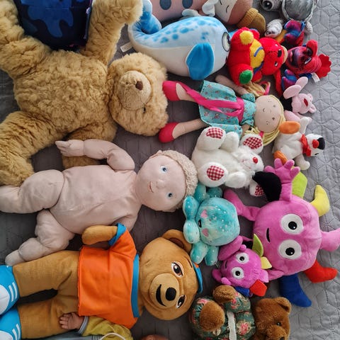 Mjukisdjur i form av olika figurer i flera färger. Setet på bilden visar tre olika gosedjur med stora ögon och mjuk stoppning. Passar som leksaker eller som prydnad i barnrum. Materialet är mjukt tyg med fyllning av stoppning, utformade för att vara lätta att hålla i för barn.