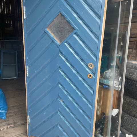 Trädörr med snedställda brädor, Dörren har karm och monterat handtag samt gångjärn. Passar exempelvis till förråd, bod eller annan byggnad där en robust trädörr önskas. Mått Bredd 1000mm