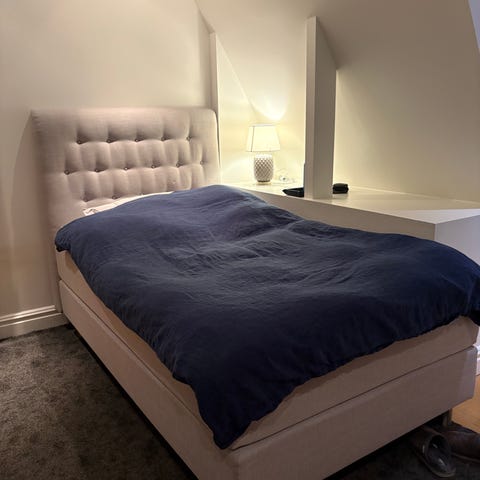Säng IKEA Skotterud 120 * 200 cm med bäddmadrass TUNSTA, ca 7-8 cm tjock, samt anpassat madrasskydd. Madrassen har en äldre fläck på ena sidan (se bild), medan andra sidan är helt vit / som ny. 2.500 kr