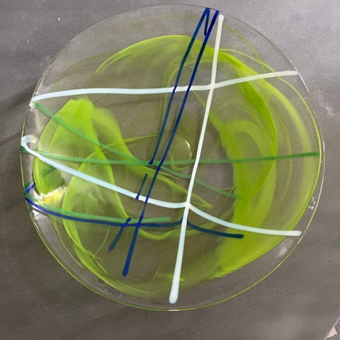 Fat i konstglas med dekor i flera färger av konstnären Cilla Adlercreutz.