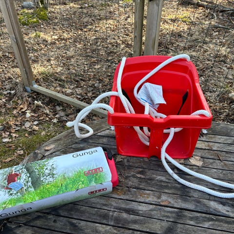 Gungor för barn i färgerna röd och vit. Gungorna har sitsar med hög rygg och medföljande rep för upphängning. Avsedda för utomhusbruk i trädgård eller lekplats där de kan hängas upp i exempelvis gungställning eller stabilt trädgren. Passar mindre barn som behöver extra stöd i ryggen vid gungning.