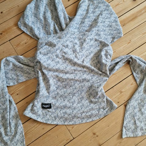 Bärsjal från Najell. Denna bärsjal heter Wrap och är redan färdigknuten! Man tar på den som en tröja och justerar sedan så att den sitter bra runt bebis. Storlek medium/large. Nypris ca 800’l