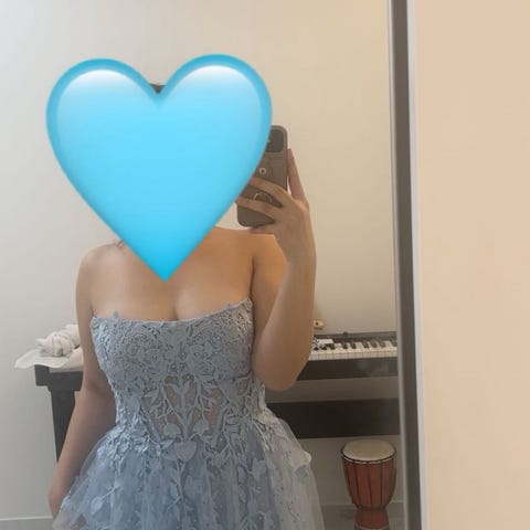Champangegul balklänning med snörning. Använd en gång, i mycket fint skick. Kommer ej komma till användning i detta hushåll igen och säljes därför. Utan behov att anpassa klänningen passar den personer med storlek XS-S och längd ca 170-176 cm). Genom snörningen anpassas storleken.