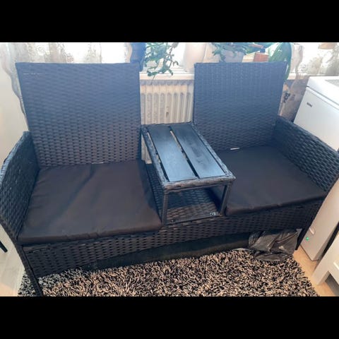 Utegrupp i konstrotting består av 2 sits soffa och två fåtöljer samt ett bord med glasskiva