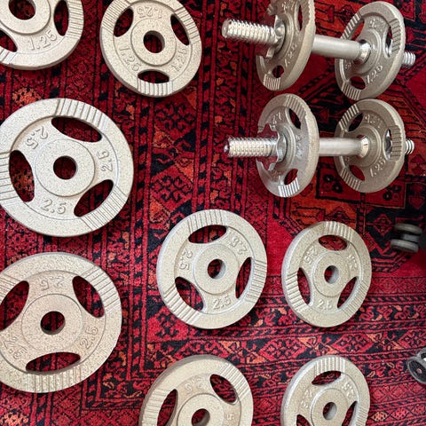 Hantelset med två hantlar och en curlstång i metall. Setet inkluderar runda viktskivor i olika storlekar som kan tas av och på för att justera belastningen. Passar för styrketräning hemma, till exempel bicepscurl, axelövningar och andra fria viktövningar. Hantlar och stång har släta greppytor i metall.