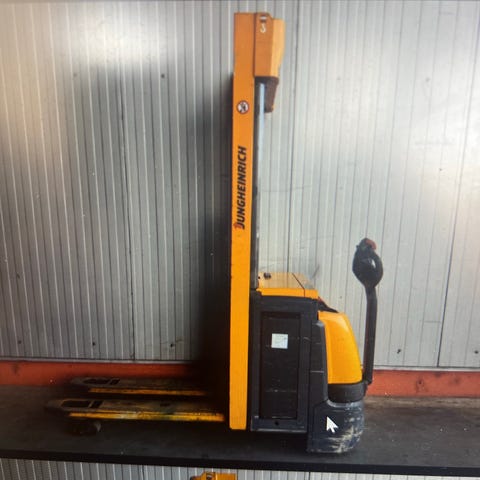 Fenwick gaffeltruck i gul färg. Trucken är utrustad med skyddstak, förarplats med stol och ratt samt hydrauliska reglage för lyft och sänkning av gafflarna. Informationsskyltar med lastdiagram och tekniska data sitter monterade på chassit. Lämplig för hantering av pallar och material i verkstad, lager eller industriell miljö.