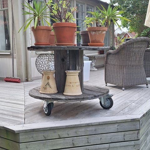Rund kabeltrumma i trä som kan användas som bord. Tillverkad i obehandlat trä med synliga skruvar och metallbeslag. Passar exempelvis som utebord, avlastningsbord eller arbetsbord i trädgård, garage eller verkstad. Färg och yta har ett rustikt, industriellt utseende med naturliga märken och tryck på ovansidan.
