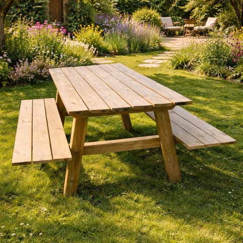 Det här är en robust trädgårdsstol i trä, byggd i en stil som liknar en klassisk Adirondack-stol. Den är tillverkad av ljusa träplankor med synliga ådringar och kvistar, vilket ger ett naturligt och rustikt utseende.