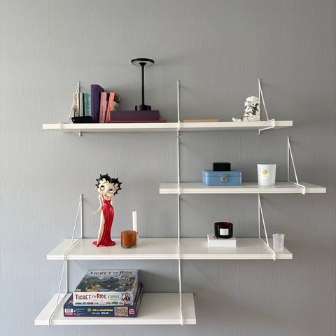 Tre hyllplan (120 cm breda, 20 cm djupa) tillsammans med sex konsoler gör att du enkelt kan skapa en snygg och praktisk förvaring på väggen. Den nätta designen tar lite plats men rymmer mycket , perfekt för böcker, dekoration eller köksprylar.