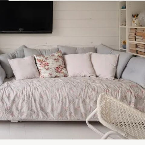 En kökssoffa, med två hål i botten för att våra katter skulle kunna leka.