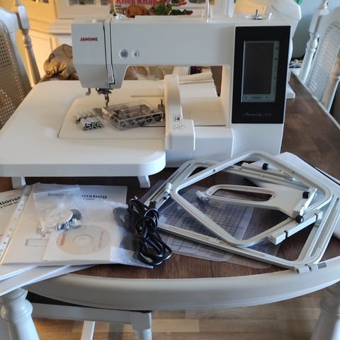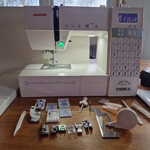 Singer Agneau d’Or EP-100 symaskin i vit plastkonstruktion. Modellen har flera förinställda sömmar som väljs via knappar på frontpanelen. Maskinen har friarm, nålplatta i metall och inbyggd spolhållare upptill. Reglage för hastighet och olika funktioner sitter på sidan av maskinen. Passar för vanlig sömnad i hemmet, som uppläggning av plagg, lagningar och enklare textilprojekt.
