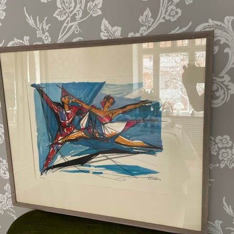 Litografi ”dans runt fredsduva” föreställande dansande figurer och en duva. Signerad med ”Picasso” och daterad ”25.7.61”.