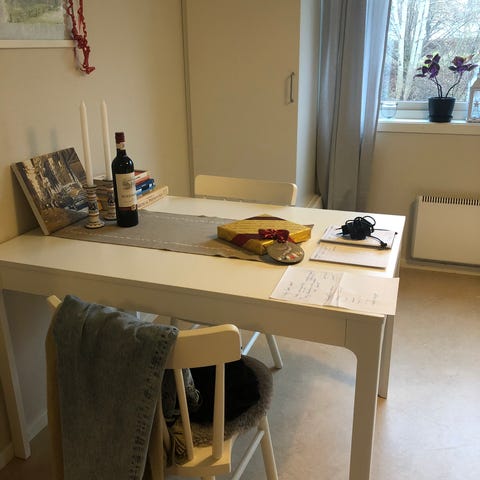 Jag har monterat av bordsskivan från benen men det är väldigt lätt att skruva fast igen