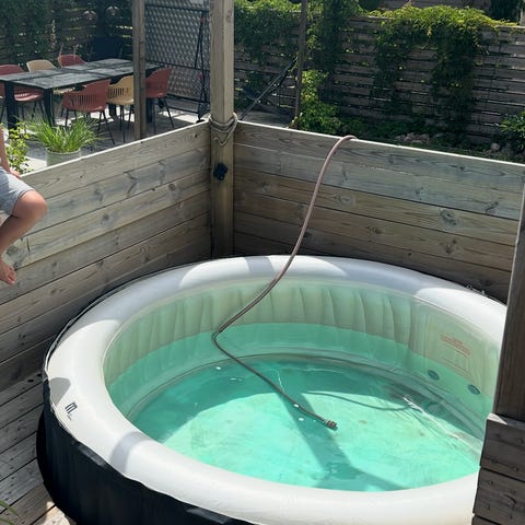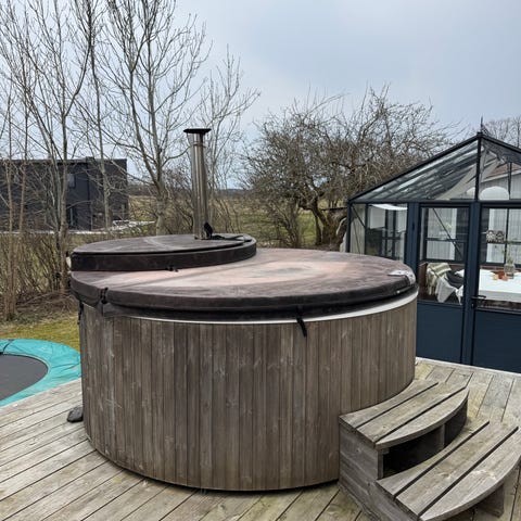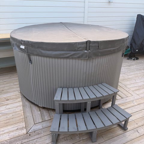Uppblåsbar rund bubbelpool med utsida i brun träimitation och matchande brunt lock. Poolen är avsedd för utomhusbruk och kan placeras på altan eller annan plan yta. Utrustad med handtag på sidorna för enklare förflyttning av locket.