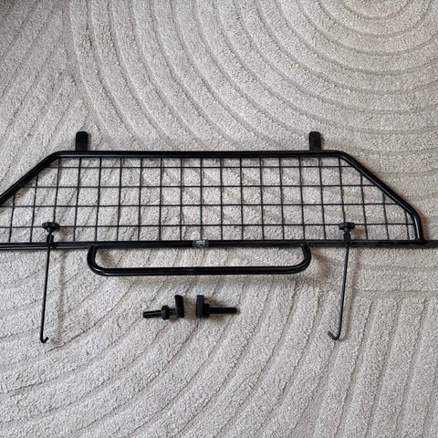 Lastgaller i svart metall. Gallerkonstruktion som monteras bakom baksätet för att avskilja lastutrymmet från kupén. Passar som skydd mellan bagage och passagerare i bil. Stabil metallram med nät i mitten för god sikt bakåt. Passar en Toyota Avensys.