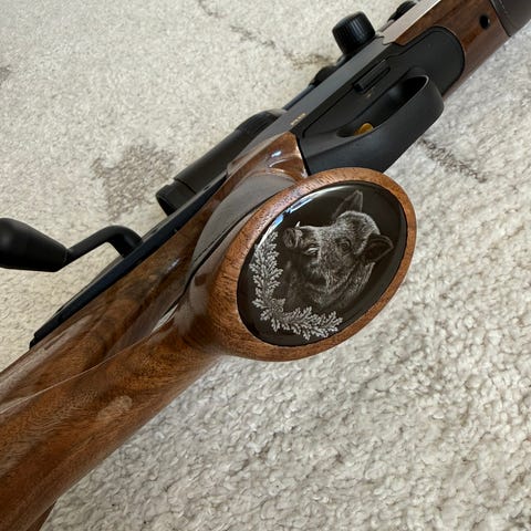 Högkvalitativ gevärsrem i mörkgrön neopren. Halkfri, elastisk och längdjusterbar med praktiskt spänne på bakstycket. Bred, mjuk axelkudde för optimal komfort. Integrerat patronfodral för två kulor av all konventionell ammunition av jaktkalibrar. Blaser snabbfästen och löstagbara selar.