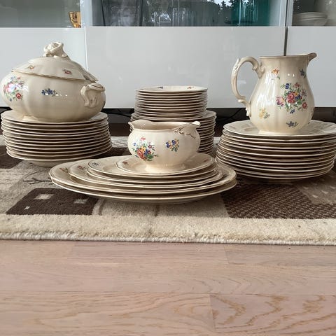 Gustafsberg Ulla servisdelsset i flint porslin med blommigt mönster. Setet omfattar flera tallrikar i olika storlekar, uppläggningsfat, kanna och såsskålar. Passar som matservis eller serveringsdelar i kök och matsal.