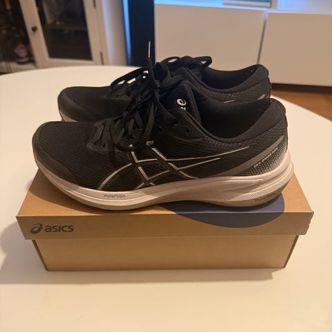 Asics löparskor Gt-1000 13 i storlek 38. Skorna är svarta med ljus mellansula och har snörning framtill. Ovandelen är i ventilerande meshmaterial och sulan är utformad för löpning. Passar för löpning och annan träning utomhus eller inomhus.