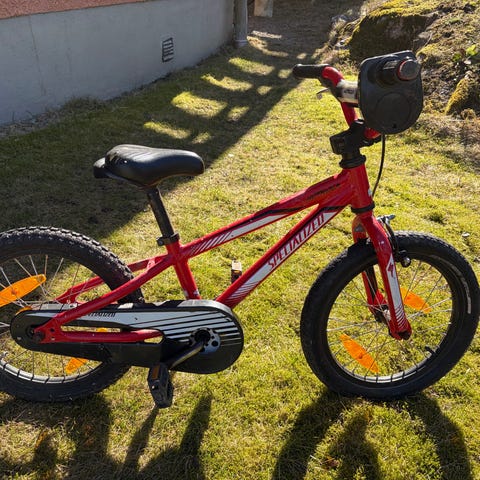 Specialized barncykel med 16" hjul. Cykeln har ram i blå färg med detaljer i orange och svart. Utrustad med fotbroms bak och handbroms fram, samt pedaler med reflexer. Lämplig som första eller andra cykel för barn som passar 16" hjulstorlek.