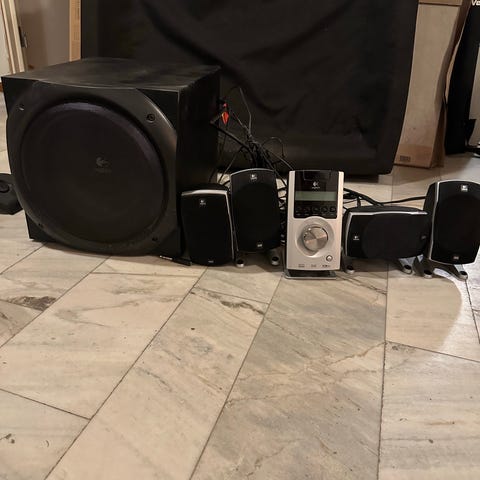 Logitech högtalarpaket med subwoofer. Paketet består av en större subwooferenhet och flera mindre satellithögtalare, lämpliga för användning till dator, tv eller hemmabio. Systemet är avsett för ljuduppspelning i hemmet och kan placeras på golv eller hylla beroende på behov. Fjärrkontroll och anslutningskablar kan ingå enligt bild, vilket möjliggör justering av volym och inkoppling till kompatibla ljudkällor.