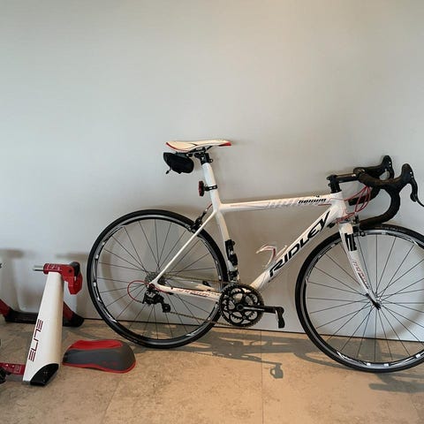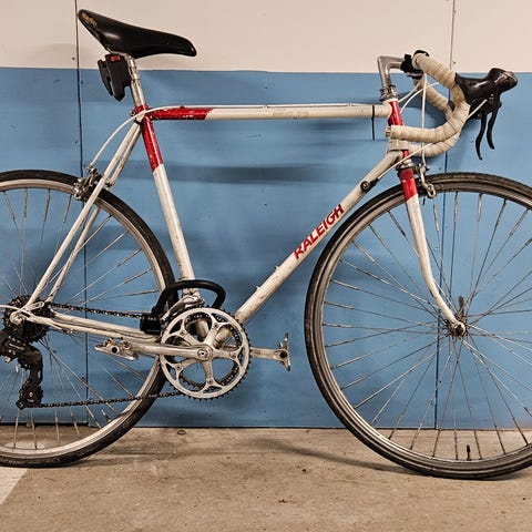 En sparsamt använd Battaglin 235 från 1999. Jag är första ägare och använde den som motions cykel i några år, aldrig tävlad eller krashad. Därefter hängande i garage tills jag satte en i en trainer för 6-7 år sedan, dock inte mycket körd där heller. Den är i originalskick, t.ex är det originalkedjan som sitter på. Väldigt krispig känsla i växlarna. Styret är omlindat. Original drickaflaska medföljer. Ramen är i lättviktsstål krom-molybden. Den är väldigt snyggt designad med vitmetalic-bas och konstnärlig logotyper. Skulle passa att hägnas på vägg efter lite putsning. 2 skrapmärke på övre ramrör. Styrlagren är tröga och behöver fixas om man ska köra. Trainer ingår, men kan säljas separat för 1500sek.
