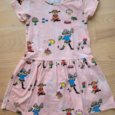 Jättefin långärmad klänning med motiv av bl.a Pippi och Herr Nilsson. Storlek 110/116.