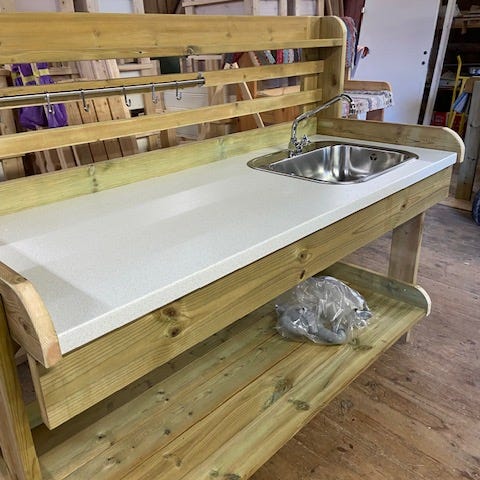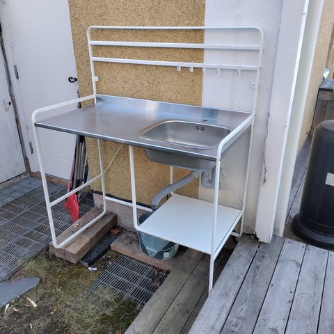 Ikea Grillskär utekök med diskho. Arbetsbänk i rostfritt stål med integrerad diskho och svart stomme. Bänken har två öppna hyllplan undertill för förvaring. Baktill finns perforerad panel med krokar och behållare för redskap och tillbehör. Passar som fristående utekök eller arbetsbänk i trädgård, på altan eller balkong. Monteringsanvisningar medföljer enligt bild.