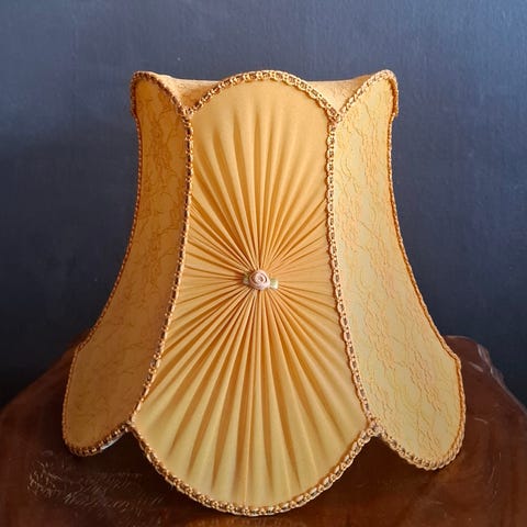 Lampskärm i textil med blommönster i beige ton med inslag av grönt och rosa. Nederkant med veckad guldfärgad bård och frans i brun/gul ton. Klassisk, svängd form med dekorerad kant upptill och nedtill. Passar till golvlampa eller större bordslampa med motsvarande fäste och sockelstorlek som skärmens ring är anpassad för.