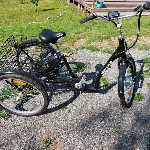 Elcykel trehjuling för unisex i ramstorlek M. Cykeln har tre hjul för extra stabilitet och är utrustad med elassistans. Den är försedd med en större korg bak som lämpar sig för transport av exempelvis väskor eller mindre inköp. Färgen är svart och modellen har upprätt sittställning med justerbar sadel och styre. Passar för vardagscykling och kortare transporter där stabilitet och lastmöjlighet är viktigt.