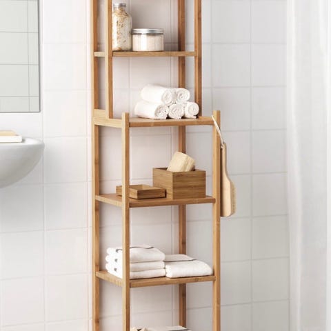 Hyllsystem i plast med fyra hyllplan. Hyllplanen är perforerade med runda hål för ventilation och avrinning. Färgen är vit. Passar för förvaring i till exempel badrum, förråd, tvättstuga eller kök. Fristående modell som kan placeras mot vägg eller i ett hörn beroende på behov.