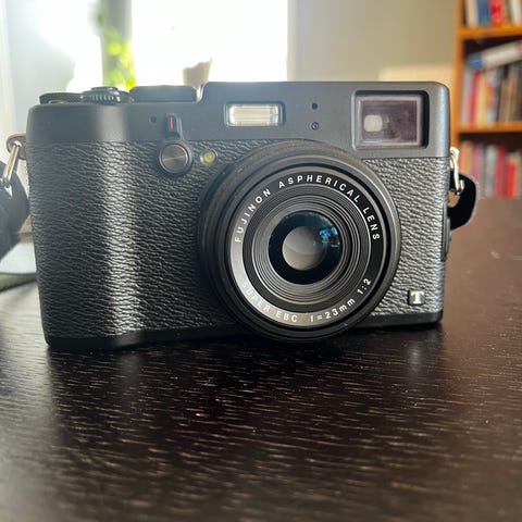 Fujifilm X100T digitalkamera i silver. Kompakt kamera med fast objektiv och inbyggd sökare. Passar för allmän fotografering och resor där en smidig kamera önskas.