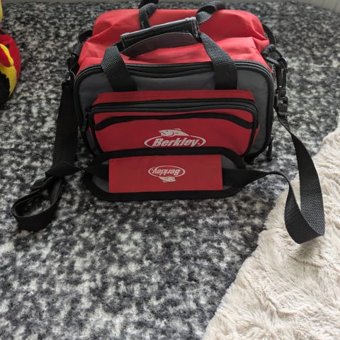 Fiskeväska från Savage gear, med stort fack ovanpå och 6 lådor totalt för fiskedrag och annat.