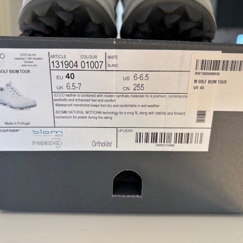 En väldigt sparsamt använd golfsko (typ 5 rundor) i yak-skinn (väldigt mjukt skonn). Storleken säger 40 men jag har vanligtvis runt 40,5-41 så skon är rymlig.