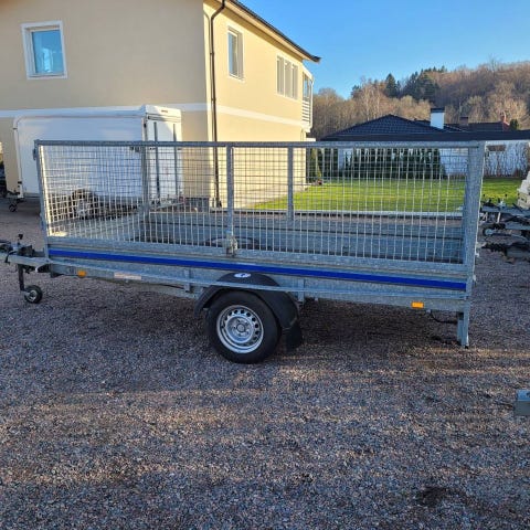 Släpvagn 750 kg med nätgrindar, ramp och tipp