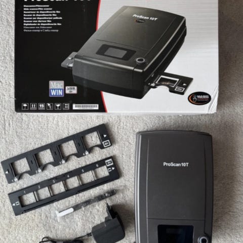 Kodak digital filmskanner i svart och gult utförande. Enheten är avsedd för att skanna och digitalisera film och dia till digitala bildfiler. På ovansidan finns knappar för meny, inställningar och bildtagning samt anslutningar för HDMI, USB och SD-kort på sidan. I paketet ingår skanner, USB-kabel, hållare/adapter, rengöringsverktyg och bruksanvisning. Lämplig för den som vill föra över analoga bilder till digitalt format för vidare lagring och visning på dator eller TV.