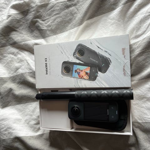 Säljer en insta360 X4 med alla tillbehör som ingick vid köp + ett linsskydd i silikon.
