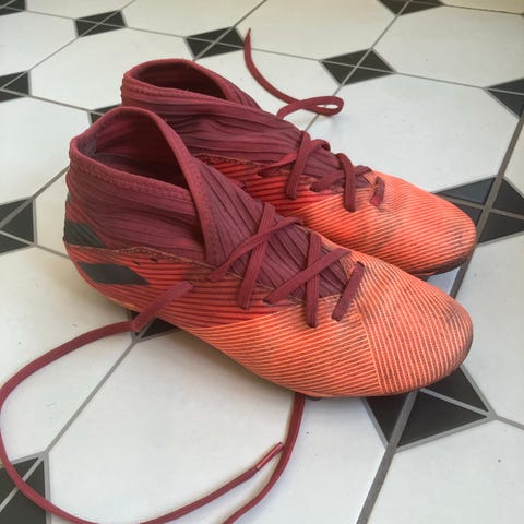 Adidas fotbollsskor med snörning och fasta dobbar. Skorna är i en orange färg med mönstrad ovandel och vita detaljer. Avsedda för spel på gräs- eller konstgräsplan. Passar för fotbollsspelare som söker lätta skor med grepp i sulan.