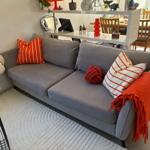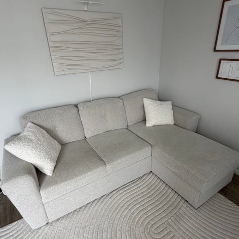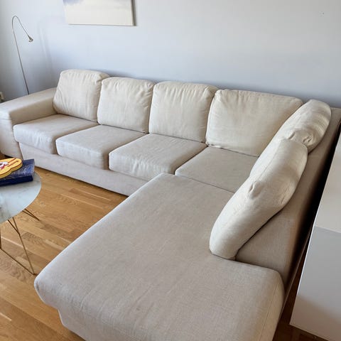 Denna trevliga soffa köptes 2018 på Mio för 7000kr. Tyget är linnestruktur beige/grå melerad och kuddarna har fyllning av fjäder. Tyget är avtagbart. Soffan är i gott skick men vi behöver köpa en större så nu är det dags att säga hejdå till denna! Soffan är 100 cm djup, 220 cm bred och sitthöjd 41 cm. Bakstycket på soffan är 50 cm men med ryggkuddarna är höjden 80 cm.