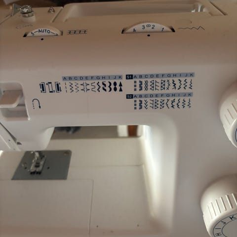 Symaskin i vit och lila färg. Maskinen har flera olika söminställningar som väljs via ratt på framsidan. Den är kompakt och lämpar sig för enklare sömnadsarbeten som uppläggning, lagning och mindre projekt i hemmet. Levereras med fotpedal enligt bild.