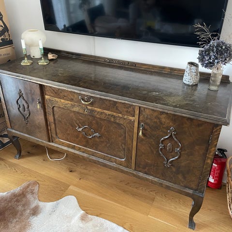 Märken/skav förekommer men stabil och överlag i fint skick för att vara en så gammal möbel.
