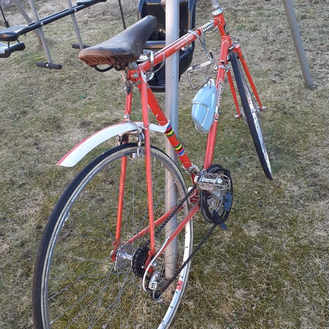 Cykeln är i okej skick men har inte använts på ett tag och skulle må bra av en service. Bakdäcket har en långsam pyspunka (troligen slang som behöver bytas). Har förvarats i varmförråd.
