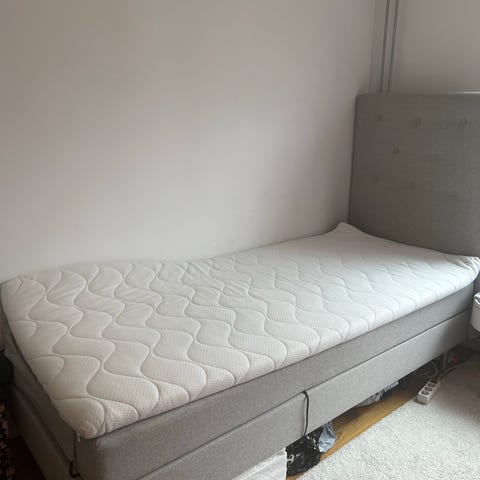 Komplett säng från Mio i grått tyg med hög, stoppad och knappad gavel. Finns några fläckar på madrassen, i övrigt i gott skick.