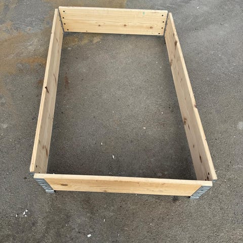 Rektangulär träram i obehandlat trä. Passar exempelvis som odlingslåda, pallkrage, ram till byggprojekt eller annan förvaring. Ramens sidor är hopfogade med metallbeslag i hörnen för extra stabilitet. Lämplig för användning i garage, trädgård eller verkstad beroende på behov och mått.