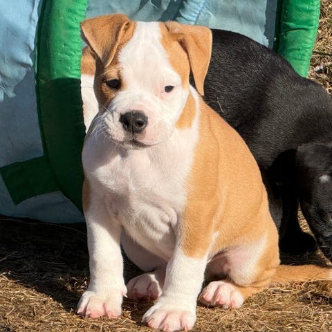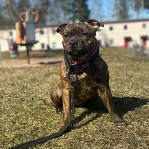 Staffen passar mycket bra som familjehund och trivs med barn och andra hundar och djur. Levereras enligt skk