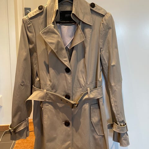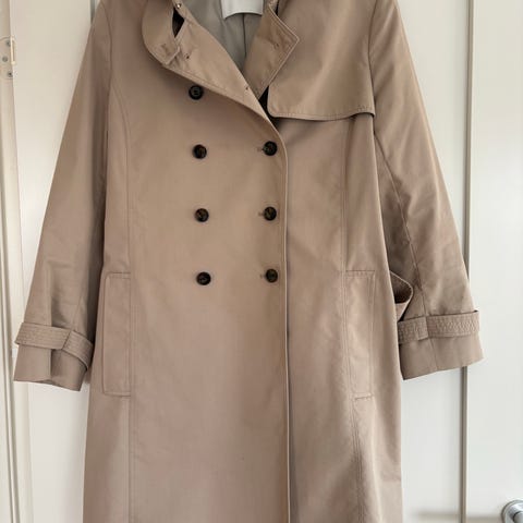 H&M trenchcoat för dam i storlek M. Färgen är beige och materialet är bomull. Modellen är en längre kappa med krage, knäppning framtill och sidofickor. Ärmarna har remmar med knapp vid mudden. Passar som ytterplagg under mildare väder och kan användas både till vardag och mer uppklädda tillfällen. A-formad.