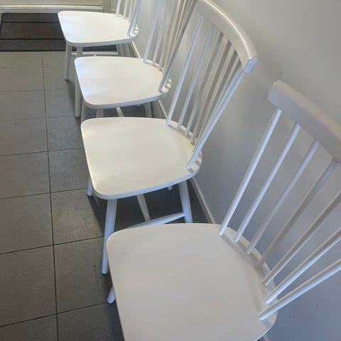 Stolarna är i använt skick med vissa skav, märken, färgsläpp. Kan målas för den händige).